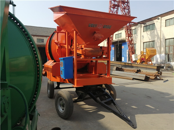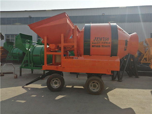該機是雙錐形拌筒正轉攪拌、反轉出料、自落式混凝土攪拌機,可攪拌塑性的半干硬性混凝土,本機拌筒由齒輪轉動,與磨擦式攪拌機相比具有傳動可靠、料斗卸料速度快、不粘料、雨霧天拌筒不打滑等優點。料斗落入地面以下(全爬機)能降低裝料工人勞動強度,如果與匹配的配料機使用,能組成簡單的電子計量攪拌站,全爬機主機攪拌和料斗提升分成兩個減速機來完成,與半爬攪拌機相比,減輕了主機攪拌減速機的負荷,增加了提升料斗的減速機。